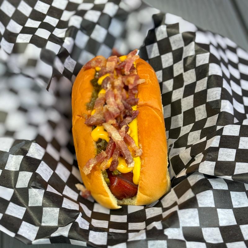 All beef frank, chopped pickled jalapenos, cheese sauce, chopped bacon, mustard.